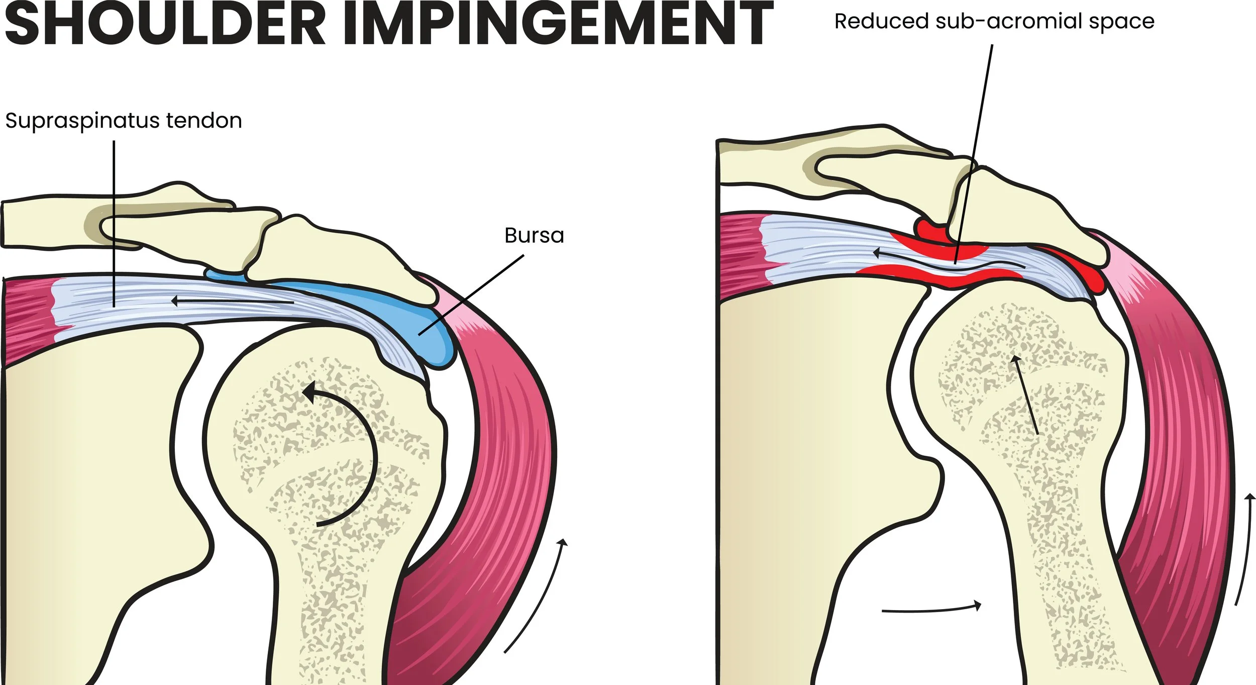 Shoulder impingement syndrome is actually a bit of a broader umbrella itself. In a nutshell, it describes a problem whereby the space above the ball of the head of the humerus and the bony bridge of the a acromioclavicular joint is narrowed, causing a pinching of the structures located in between, mostly some of the rotator cuff tendons and the bursa.